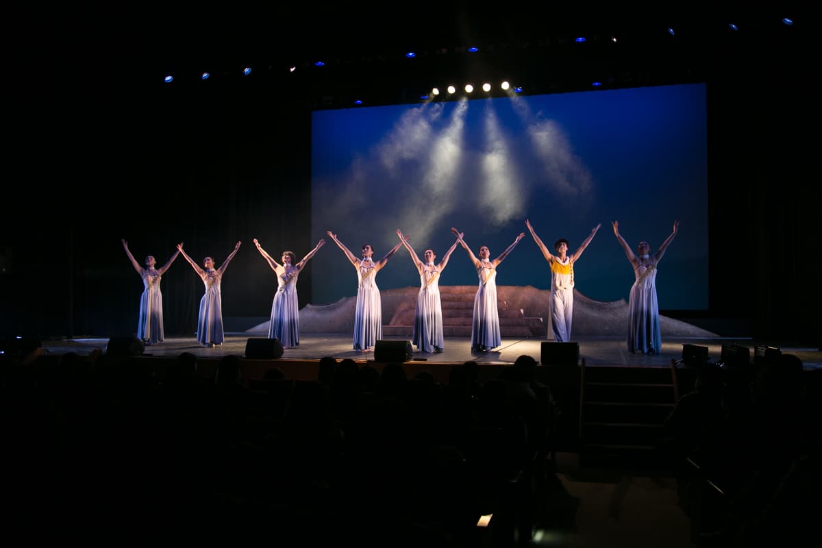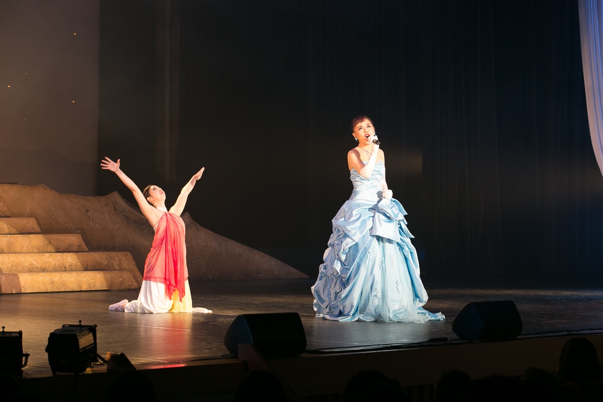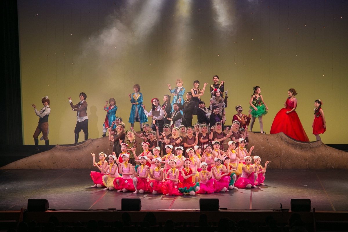 制作は、りら創造芸術高等学校特別講師である天翔りいら先生を中心に本校教職員も関わり、元宝タカラジェンヌ5名と、和歌山県においてワークショップ、オーディションを経て選出された子供から一般の方々53名 が出演し、本校生徒たちも、音響、場内担当など各部署に分かれて 現場の研修として参加させてもらいました。
