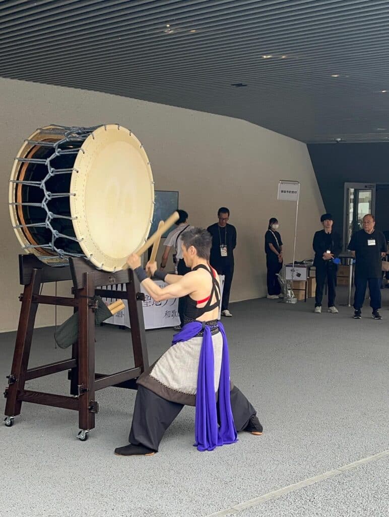 そのオープニングとして、入り口にて本校特別講師、嶋本龍先生による太鼓1人打ちの演奏、また昼過ぎに本校生徒による和太鼓の演奏を披露しました。