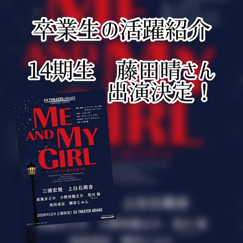 本校卒業生、14期生の藤田 晴(ふじた てる)さんが東宝ミュージカル『ME AND MY GIRL』への出演が決定いたしました!