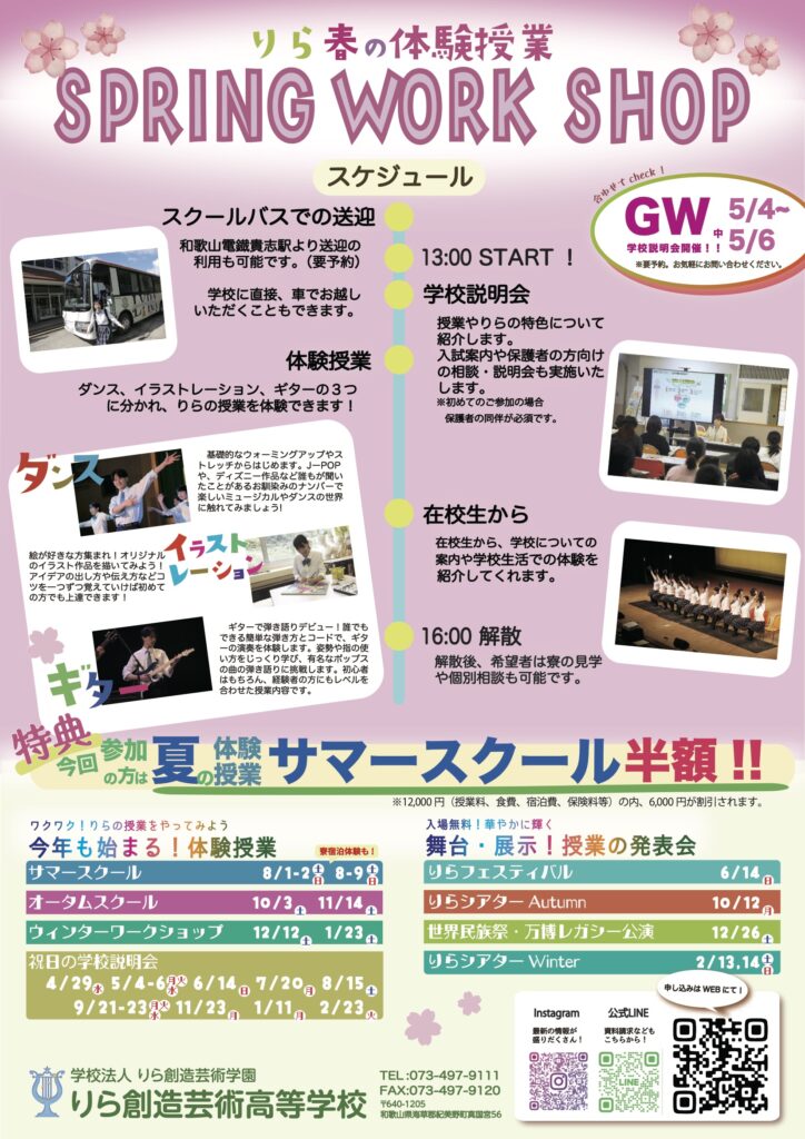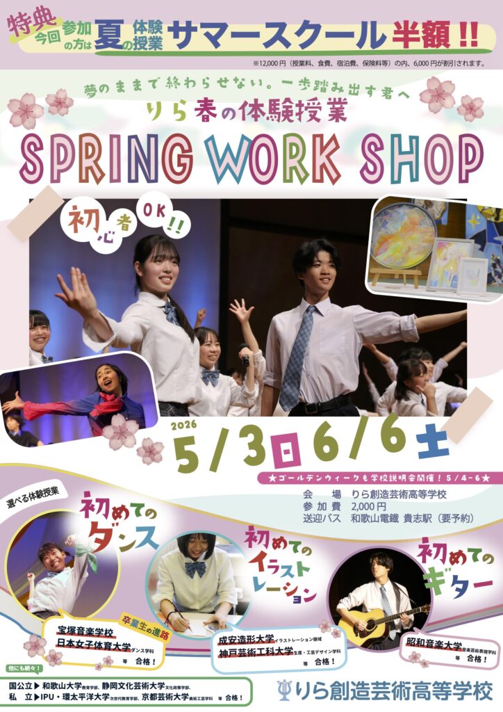 | 日時 | 【第1回】2026年5月3日(日) 【第2回】2026年6月6日(土) 12:30 受付開始 集合場所:りら創造芸術高等学校 13:00~学校説明会(入試説明含む) 14:30~参加者:ワークショップ参加 保護者:個別相談後、ワークショップ見学 15:30 ワークショップ終了 施設見学・アンケート記入・在校生メッセージ 16:00 終了 ※上記スケジュールは目安時間です。進行状況により終了時刻等が急遽変更となる場合があります。 |